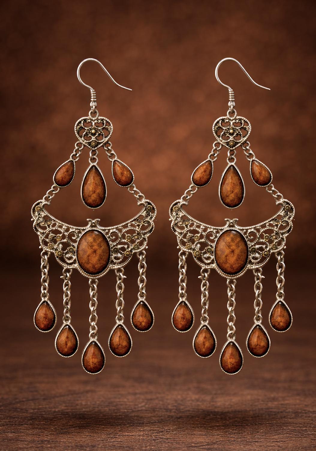 The earrings feature intricate antique silver-tone filigree detailing, giving them a delicate, handcrafted look. At the center and throughout the design are orangey-brown marbled stones, each with a subtle crackled texture that adds depth and character. The stones are set in smooth bezels and appear slightly muted rather than overly glossy, creating a more refined, earthy feel.