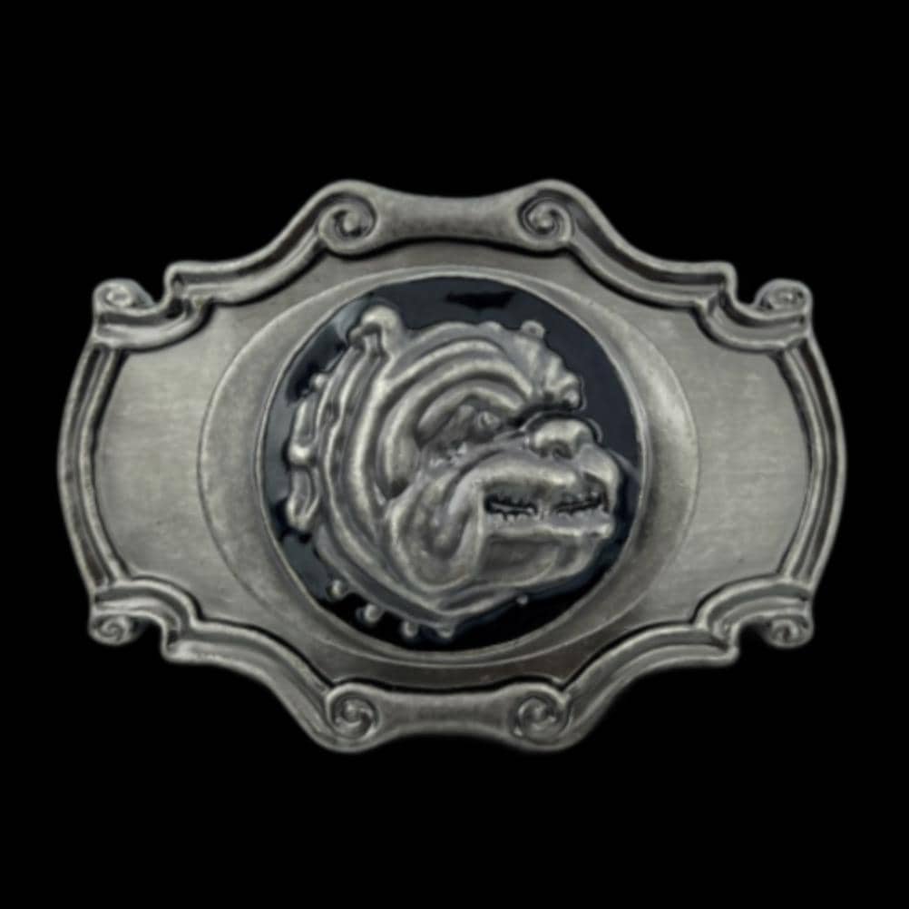 This Bulldog head belt buckle pet house outfitted with a strong collar, complete with a spikes.