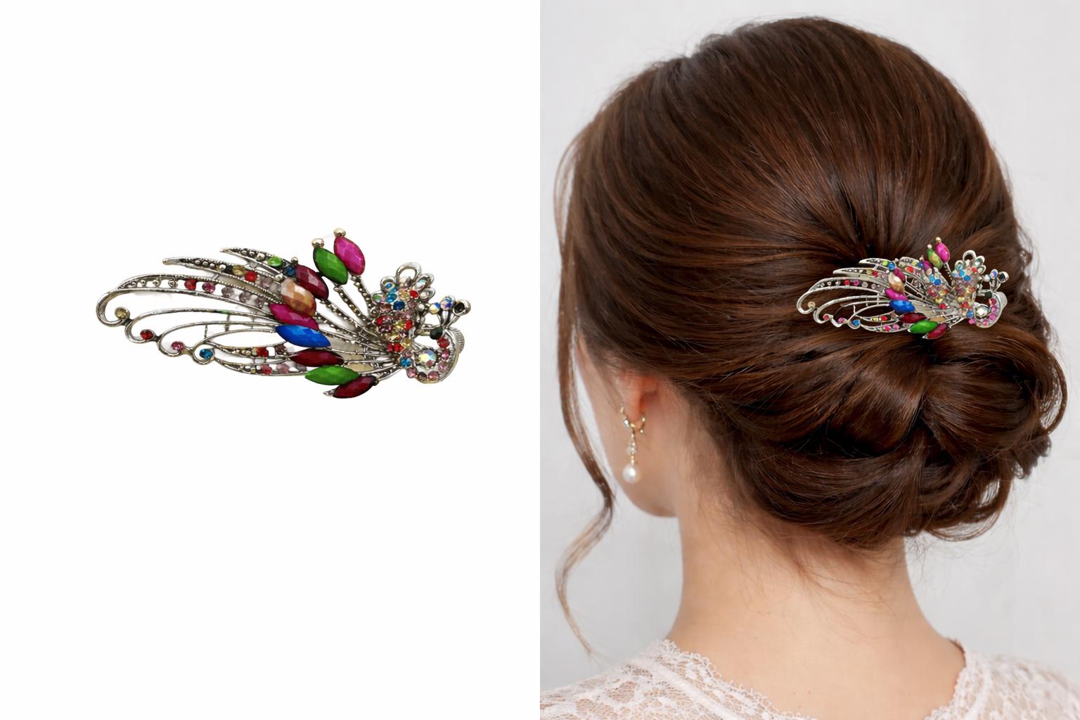 Introducing our Peacock Rhinestones Hair Clip, the elegance and sophistication, designed to enhance your look with timeless glamour. Carefully arranged rhinestones adorn this exquisite hair accessory, creating a captivating effect that reflects light from every angle, ensuring you shine with radiant beauty every day.