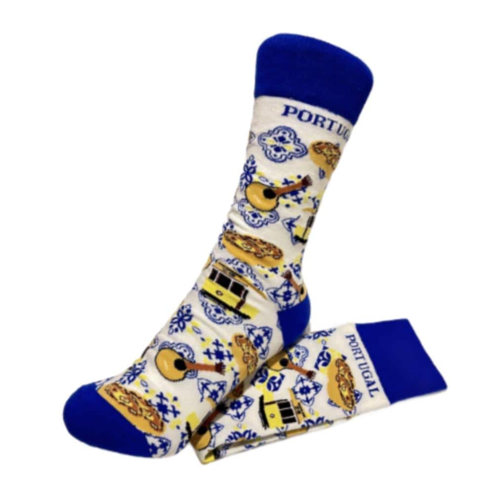These Portuguese socks are a unique and beautiful gift for anyone who appreciates the rich cultural heritage of Portugal. They are made of a high-quality cotton blend that will keep your feet cosy and soft. The socks feature a stunning Portuguese pattern that is inspired by the traditional Natas - Fado - Yellow Tram. The pattern is elegant and colourful, with shades of blue, yellow and white. These socks are a great way to add some flair and personality to your outfit, whether you are dressing up or down. They are also perfect for travelling, as they will remind you of the amazing sights and history of Portugal. These socks are one size fits most
