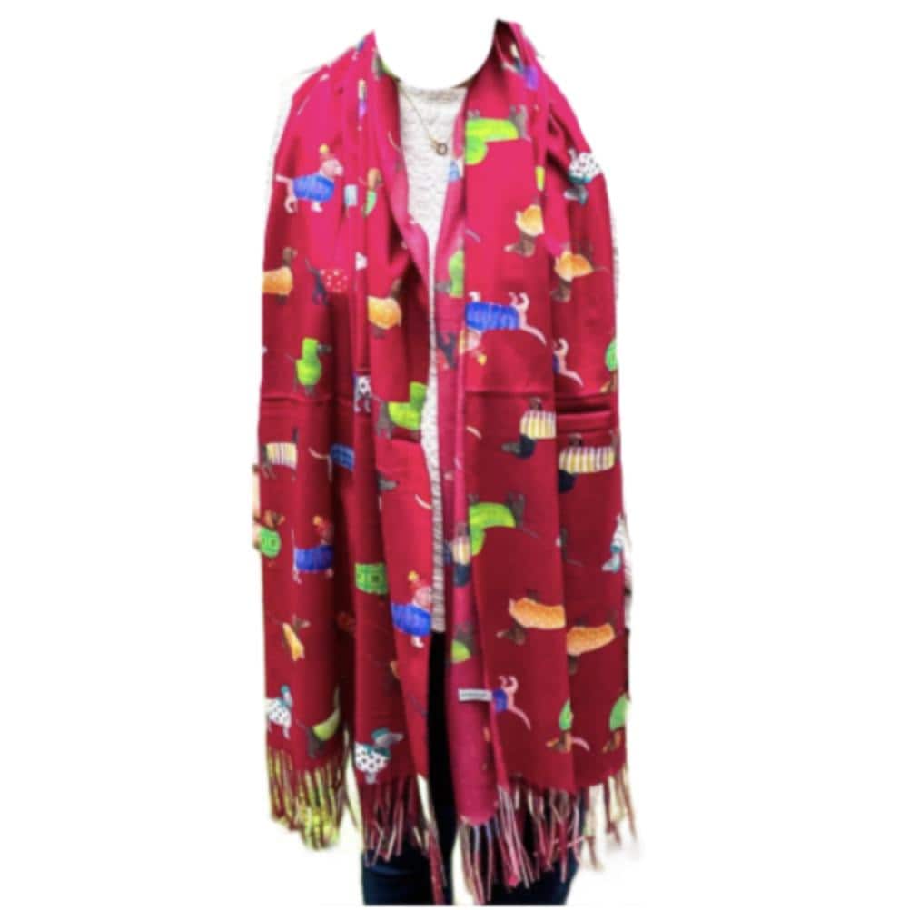 Wrap up in style with this gorgeous Sausage Dog Scarf, the perfect accessory for dog lovers. Crafted from soft 100% polyester, this deep red scarf is adorned with an array of charming sausage dogs, each wearing a colourful coat for a fun and playful look.