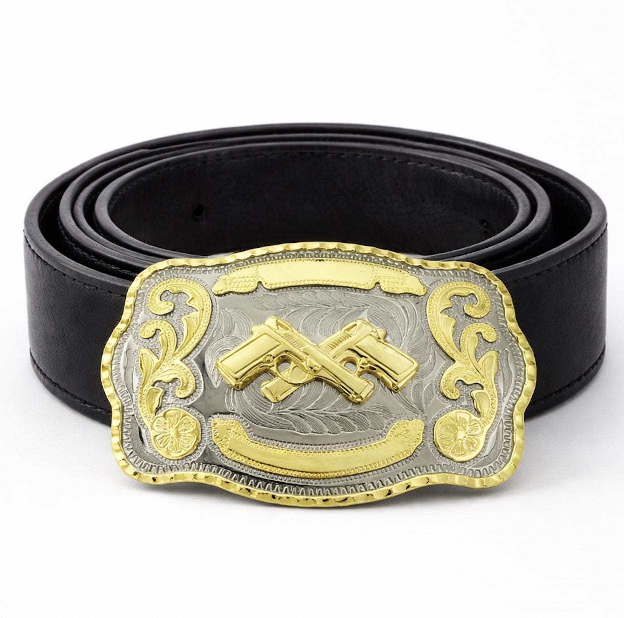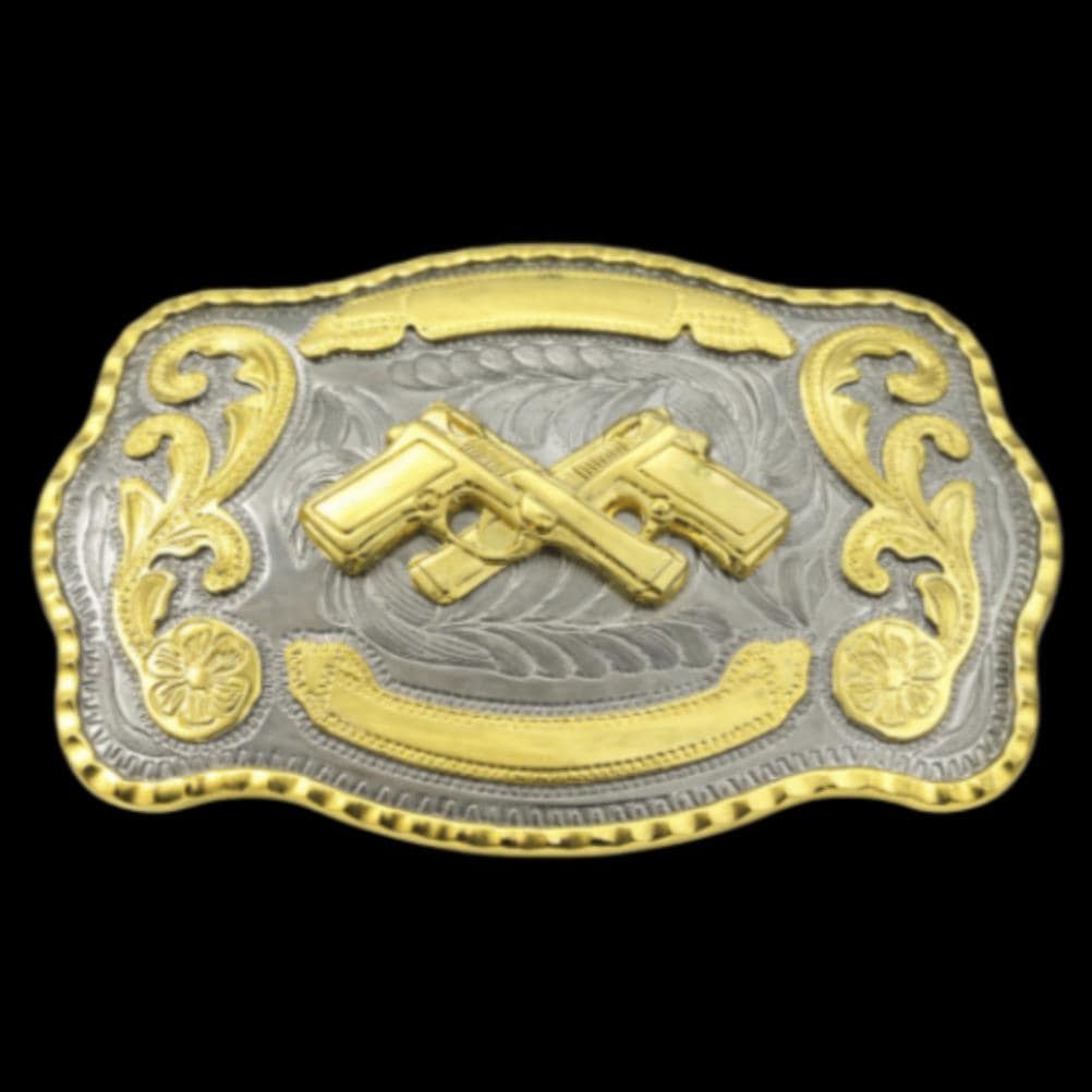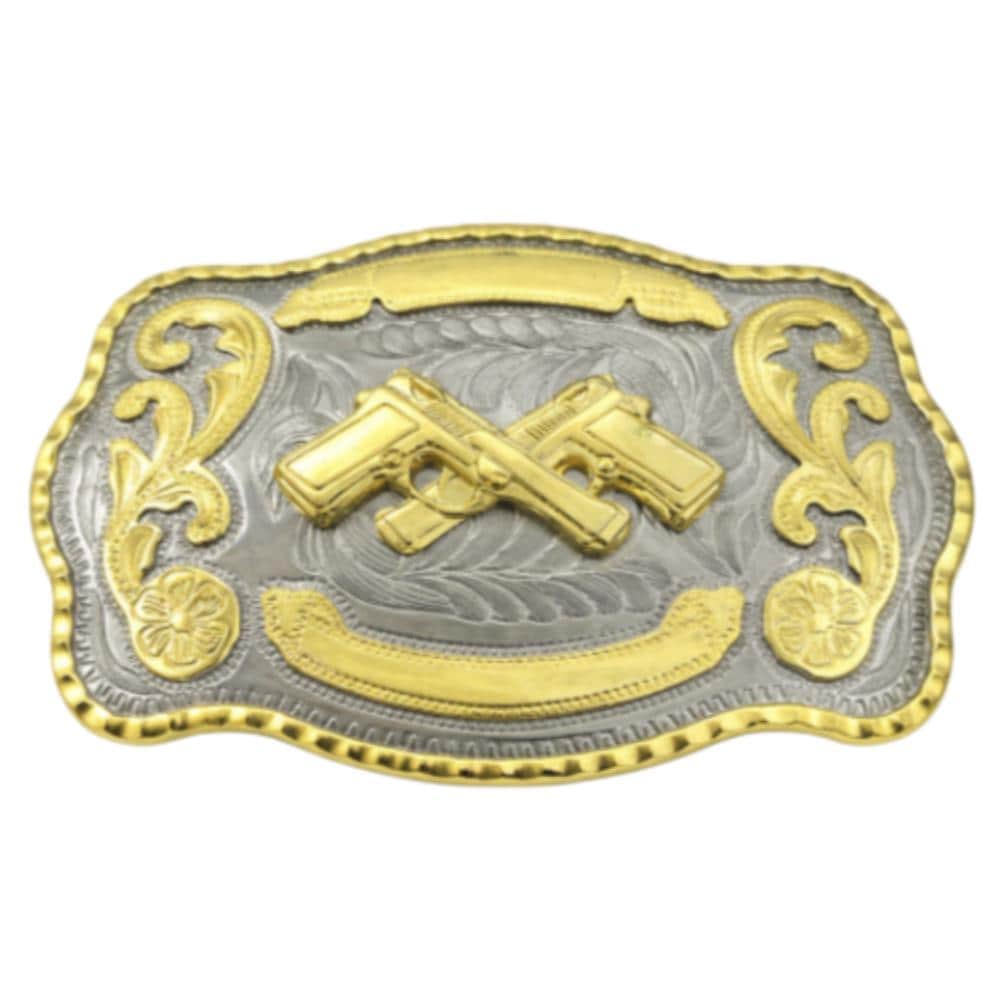 Western Style Cowboy Crossed Gun Shooter Belt Buckle Silver Gold Tone