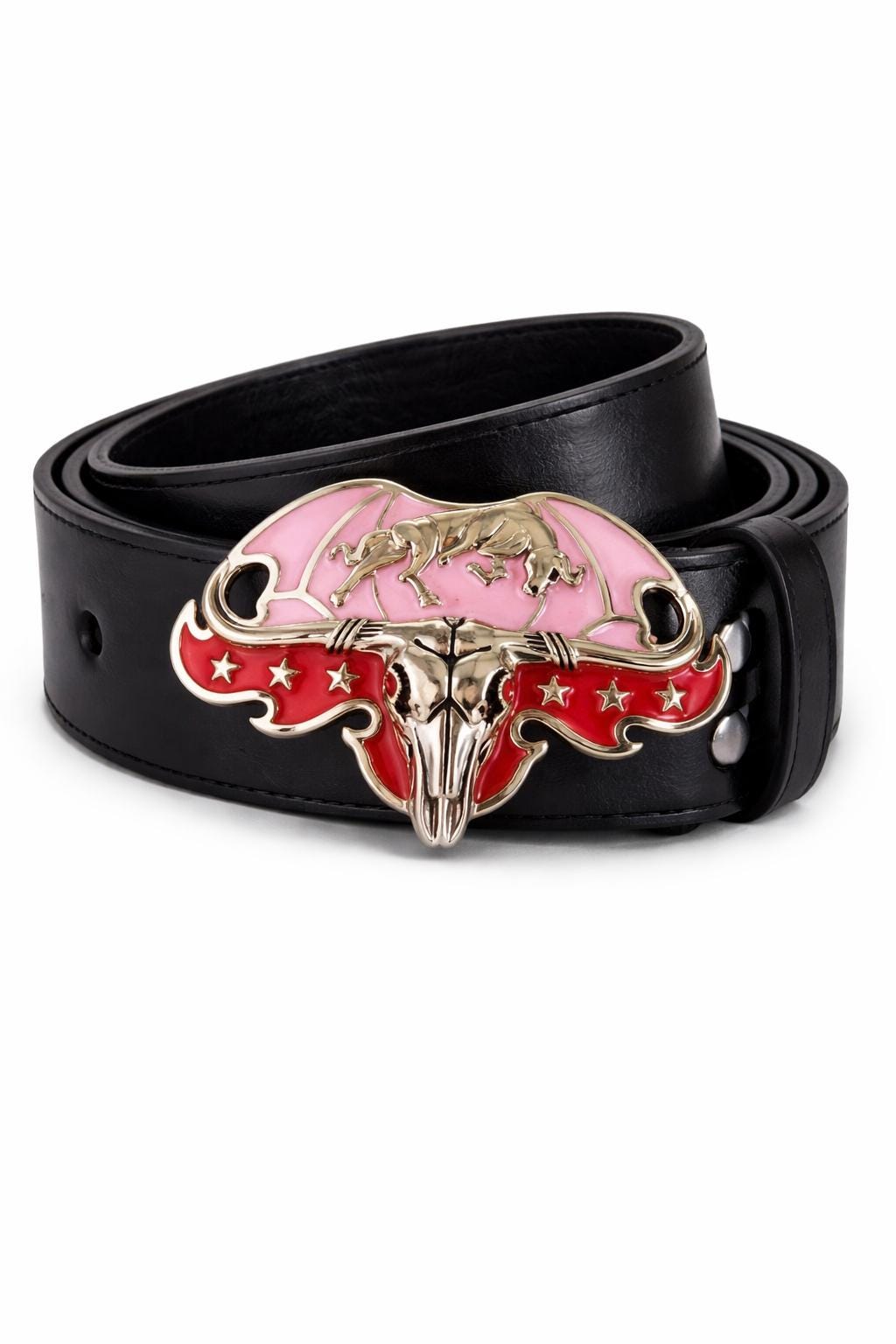 This classic Western belt buckle features a bright pink finish and intricate Longhorn and Cow Steer designs, offering a timeless aesthetic.