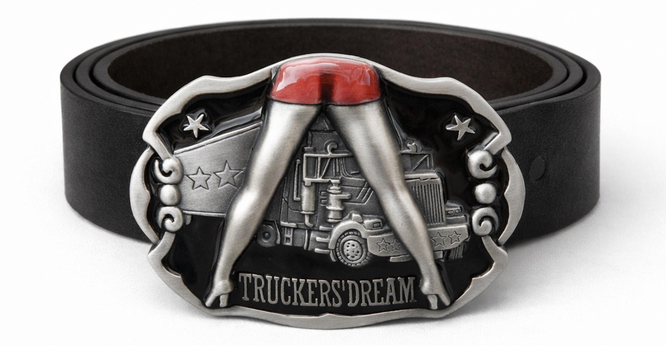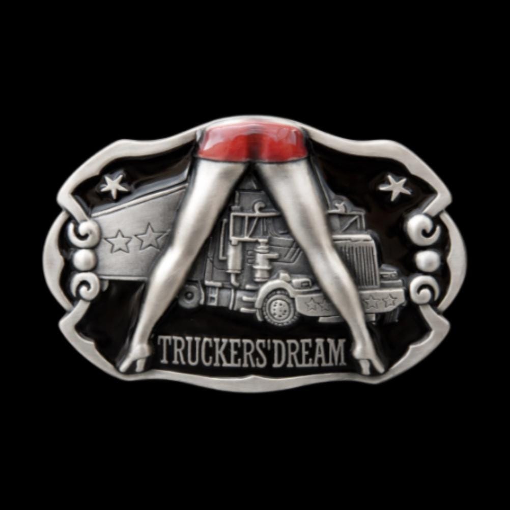Trucker Dream Belt Buckle with a naked girl's long legs over truck!